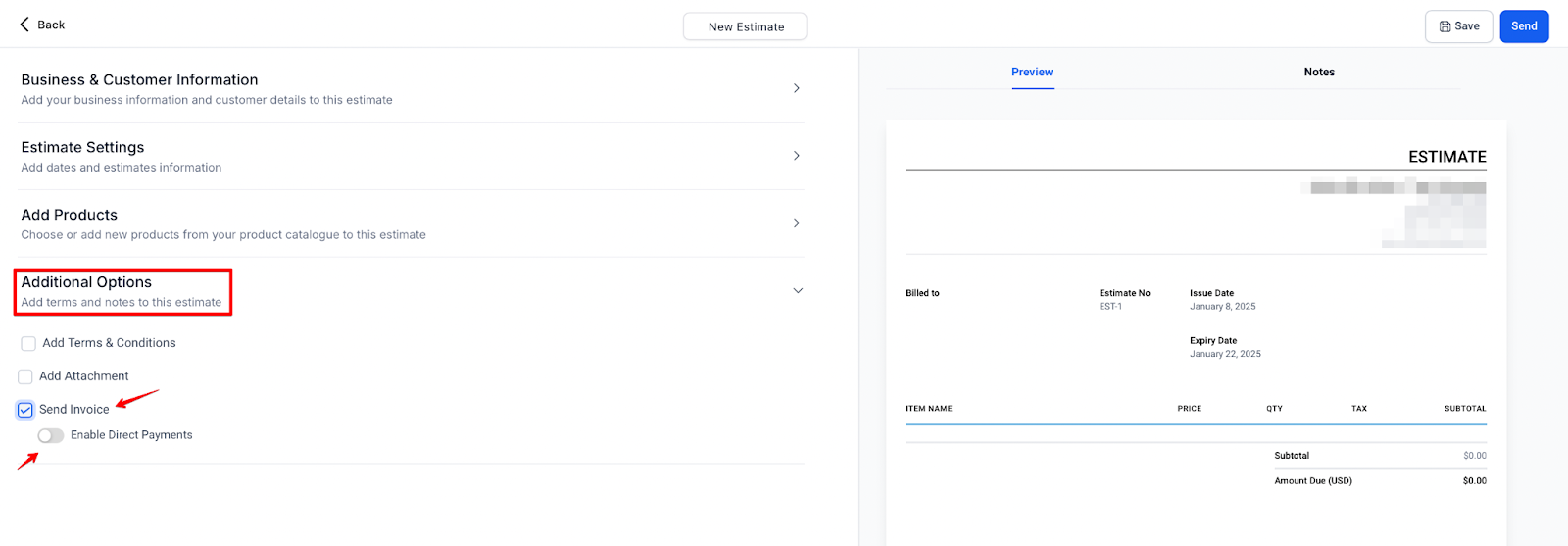 - Auto-Invoicing Post Acceptance offers automated invoicing upon estimate acceptance, with the option to redirect recipients directly to the invoice for immediate payment.