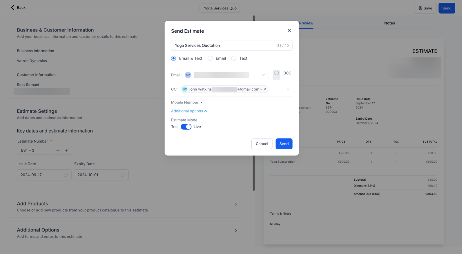 - Click ‘Send’ to share the estimate with your client via email or SMS.