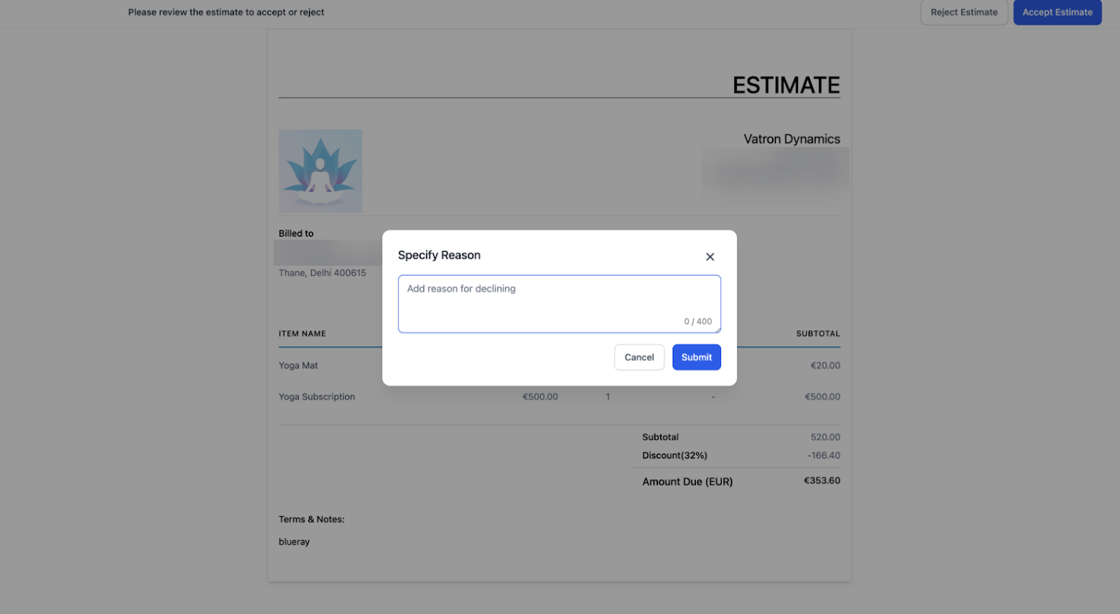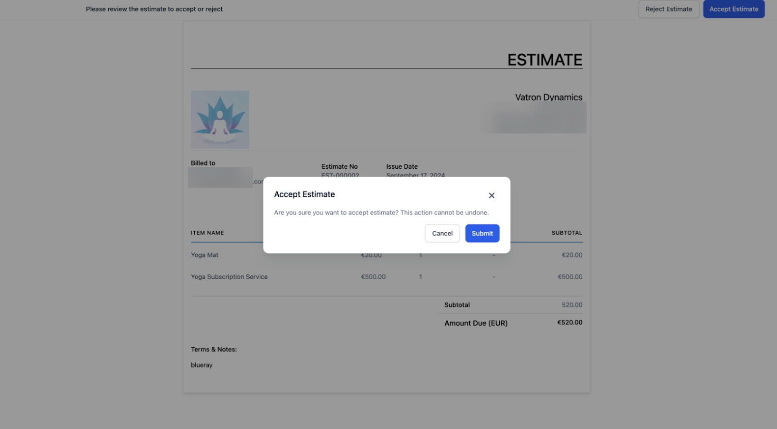 - Once sent, clients can review the estimate and either accept or reject it.