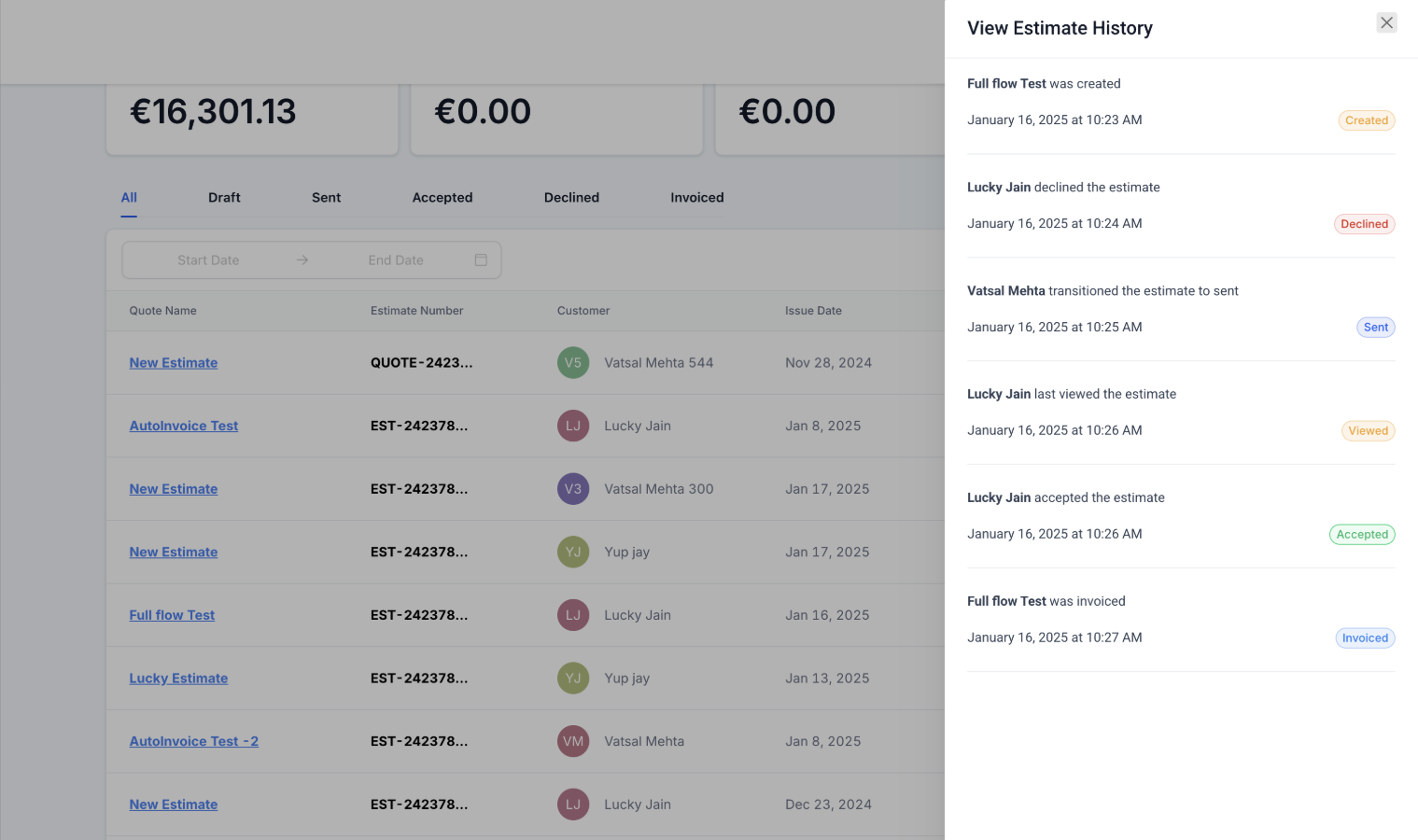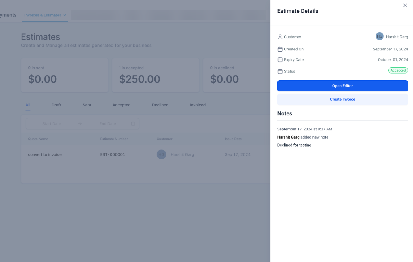 - Tracking and Management: Easily track the status of all estimates, whether they are in draft, sent, accepted, declined, or invoiced. This visibility helps businesses manage their sales pipeline effectively and keep a record of all client interactions.