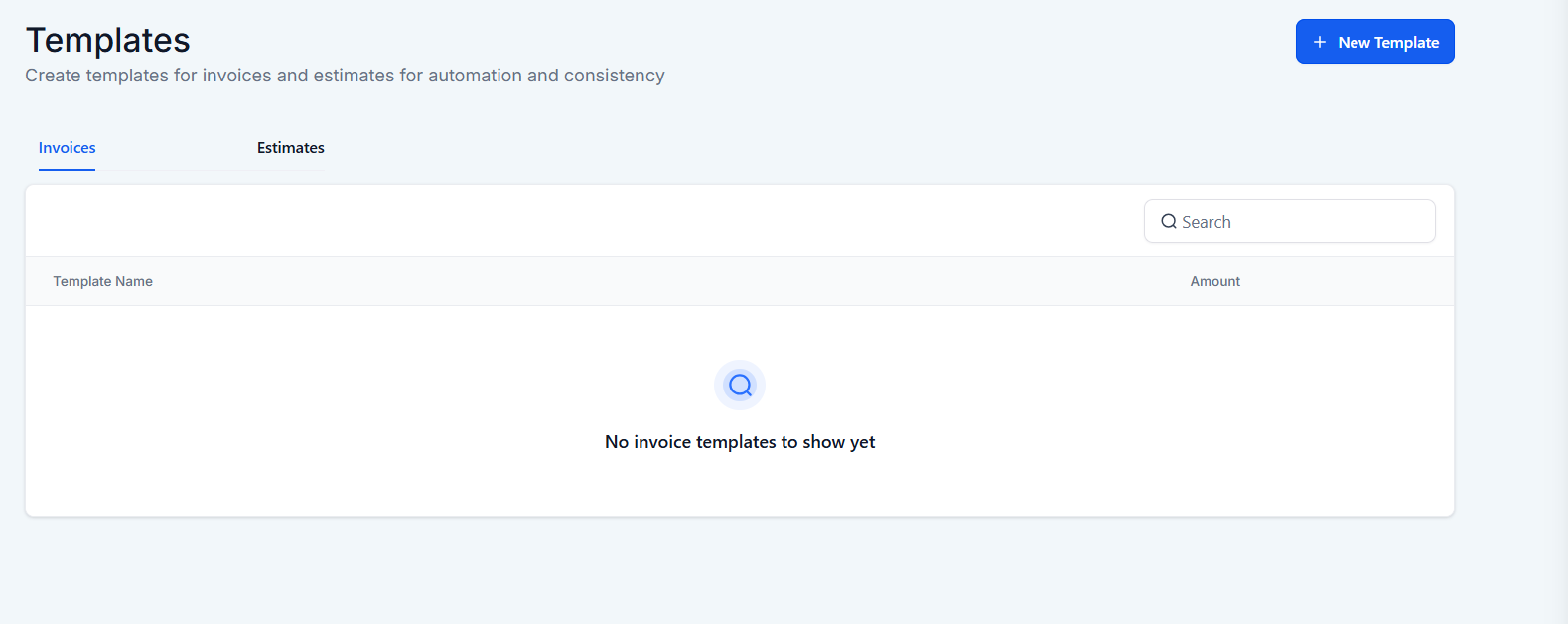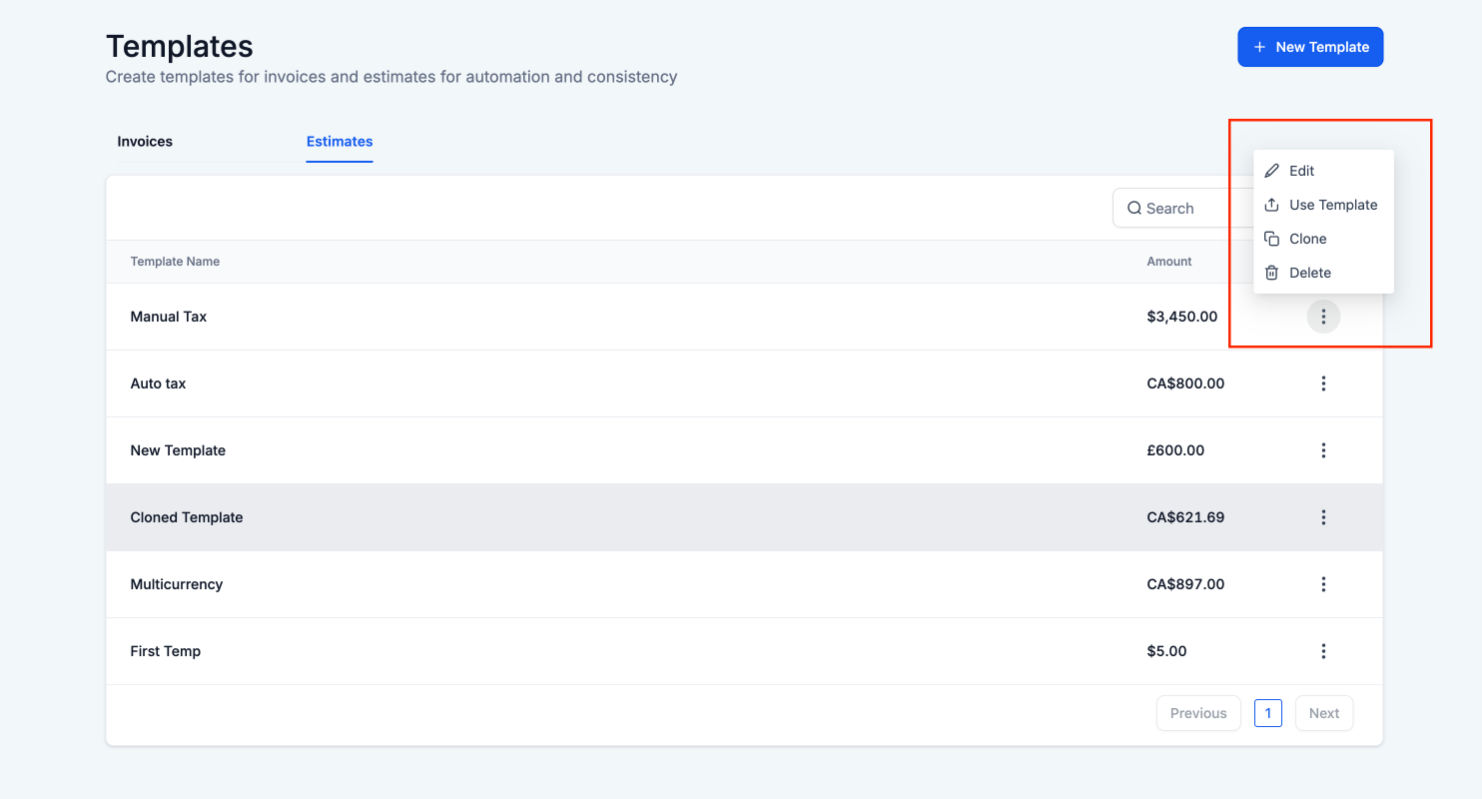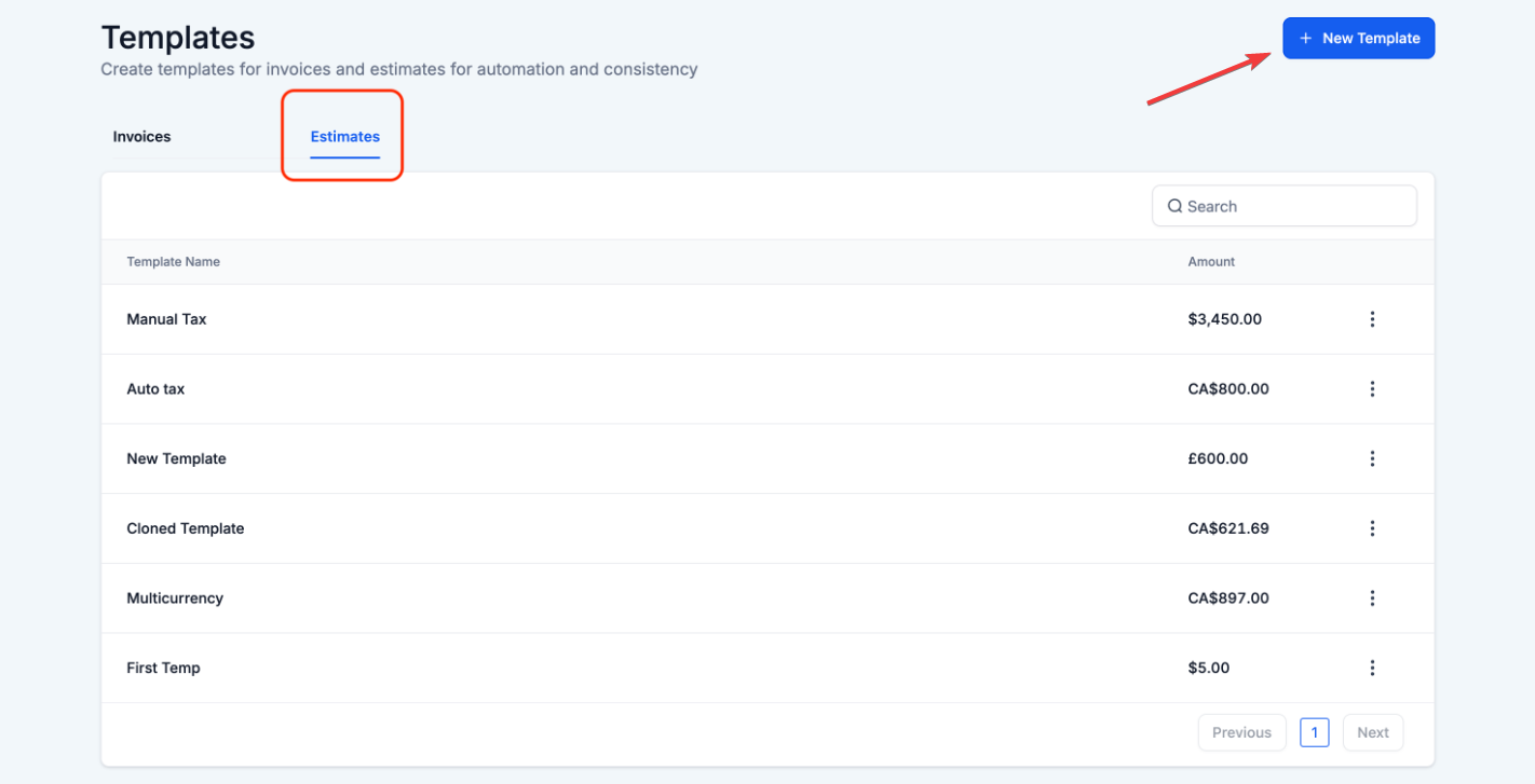 Section titled “Estimate Templates”Users can easily create, save, and clone templates within the Templates section of Invoices and Estimates.