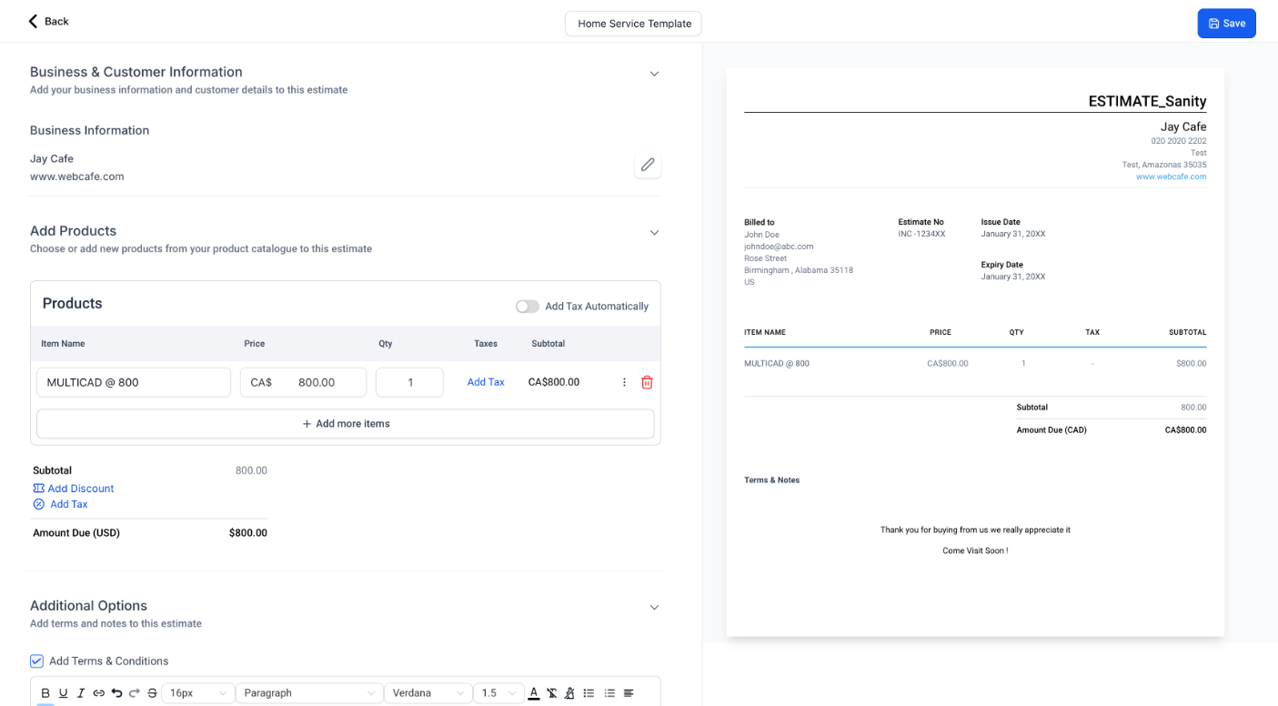 - Customization Options: Personalize your estimates with your company’s branding, terms, and other relevant information. Customization helps maintain a professional appearance and ensures that all communications align with your brand.