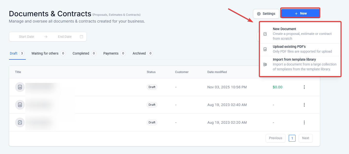 Access Payments on the left > Documents & Contracts at the top > Click on + New to start creating your document.