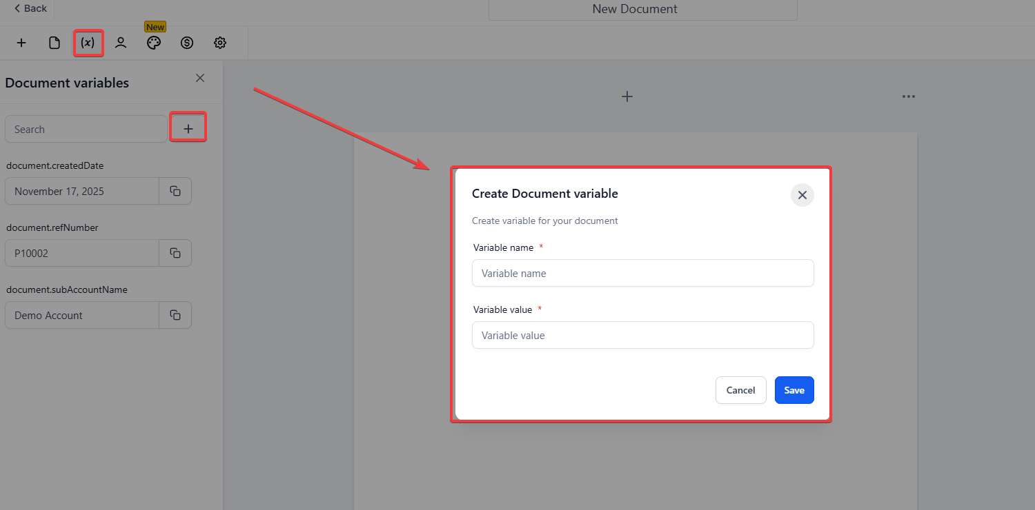 Question: How do I create document variables? Answer: To create document variables, go to Payments > Documents & Contracts > Click on + New to start creating your document. Then, insert the variable name (e.g., customer_name, project_name) where you need dynamic content.