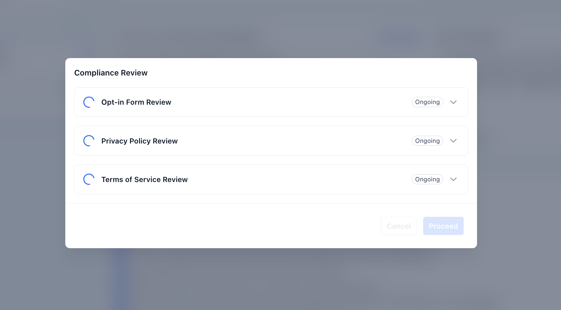 - Blocking Mechanism: The campaign submission is temporarily held until the compliance review window has been viewed, ensuring users are aware of their compliance status.