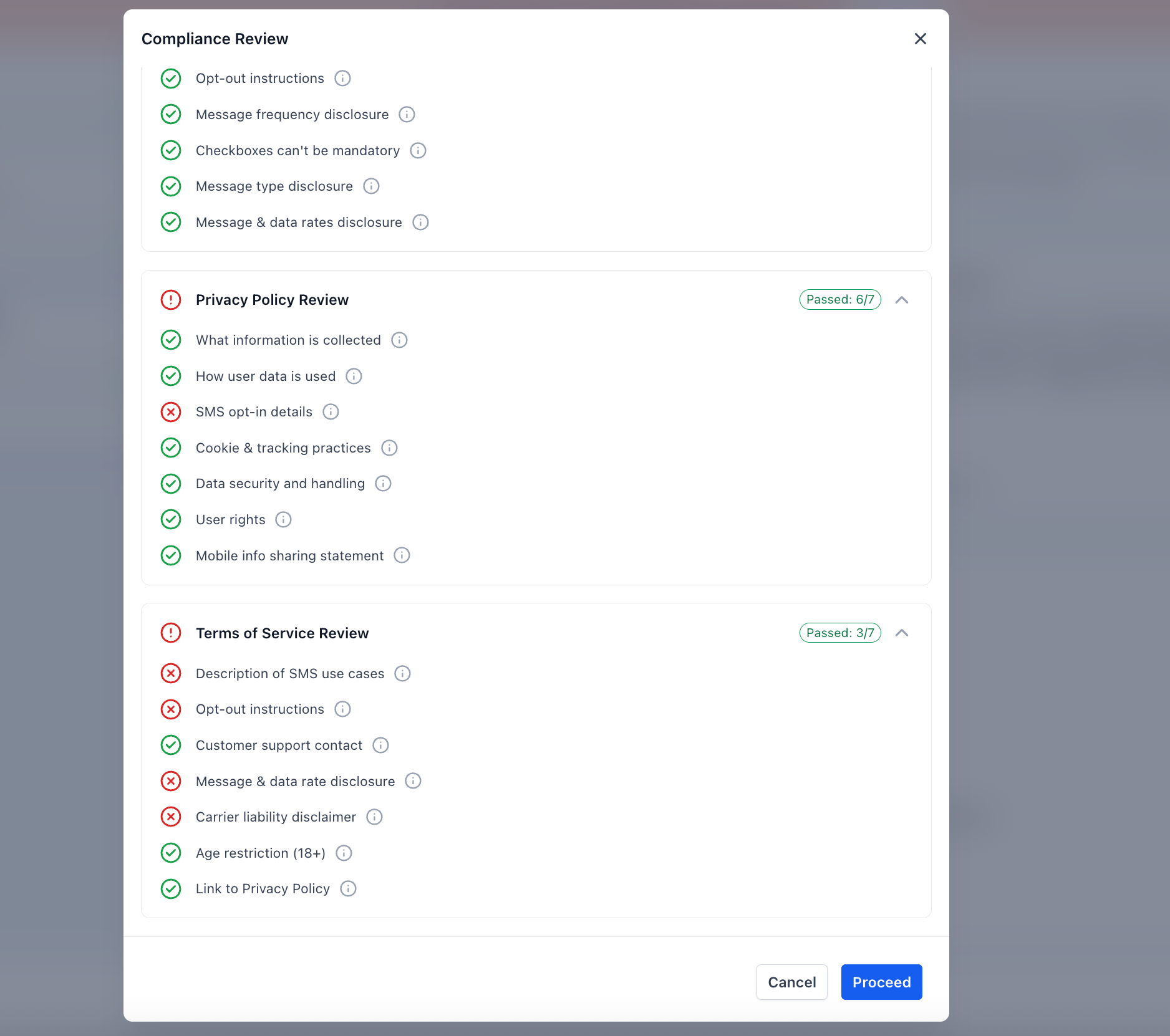 - Reduced Rejection Rates: Addresses the most common causes of campaign failure, such as missing opt-in disclosures or incomplete legal links.