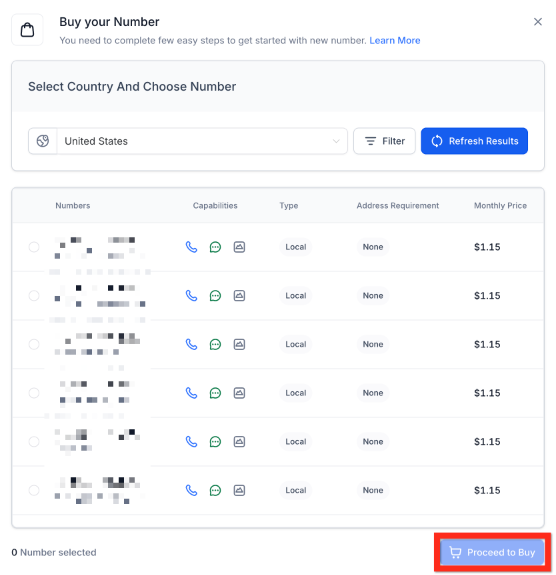 Section titled “2- Acquiring a Phone Number”Establish a local presence by adding a dedicated line: