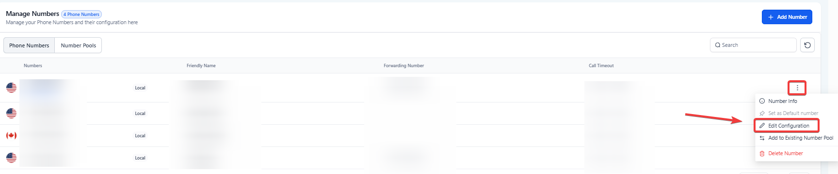 1- In Settings > Phone Numbers, click the 3-dot action menu next to your active number.