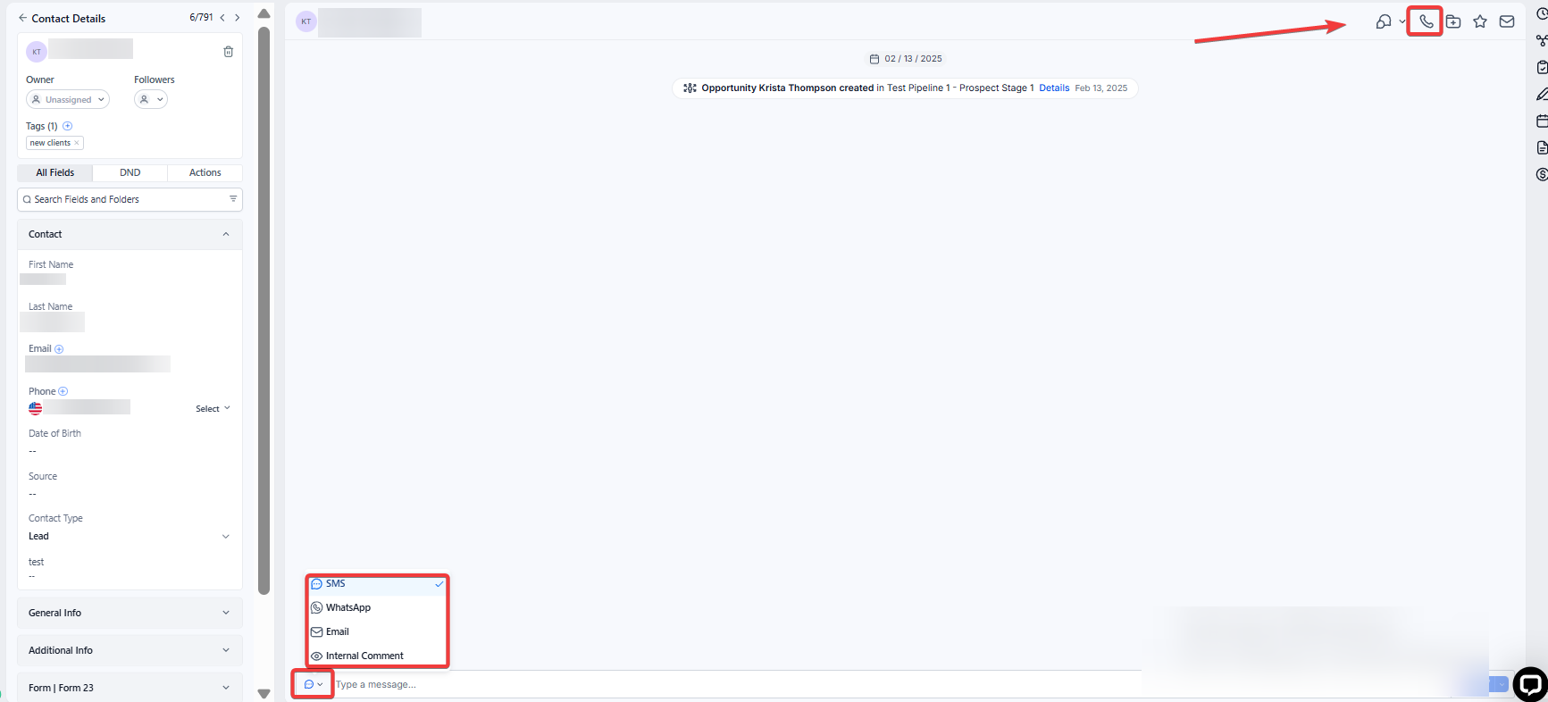 4- To SMS or Email: Use the message composer at the bottom middle, toggling between the SMS and Email tabs as needed.