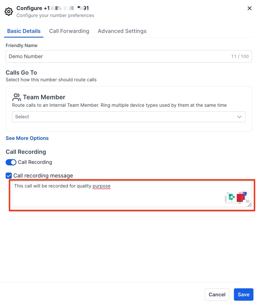 - Check the checkbox for Call recording (Default message: This call will be recorded for quality assurance).