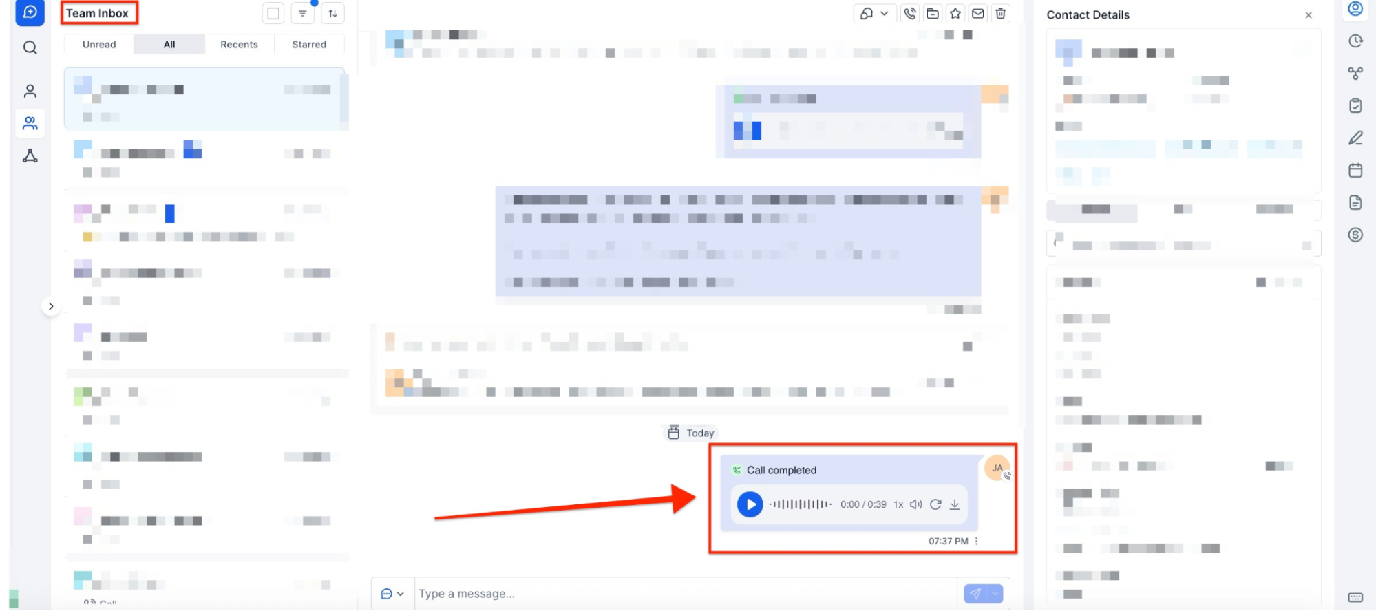 - Contact Details: Navigate to the Contacts tab, select the contact, and find recordings in the conversation panel.
