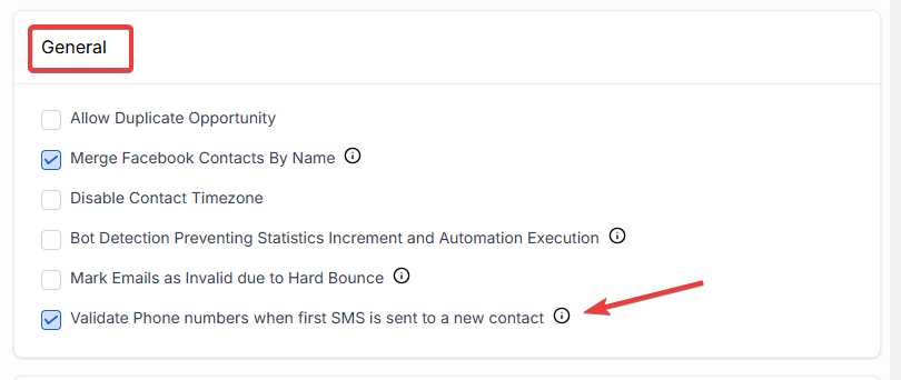 Locate SMS Validation Settings: Scroll down to find the option ‘Validate phone numbers when the first SMS is sent to a new contact.’