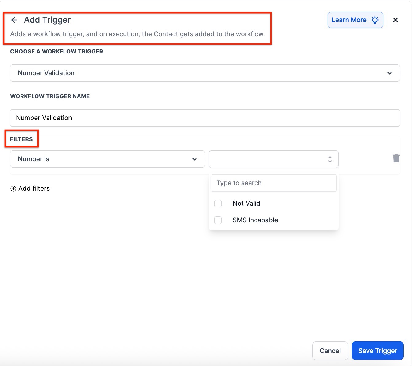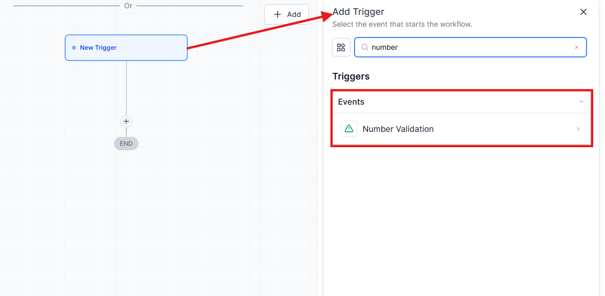 - Add a Workflow Trigger, and choose “Number Validation” from the dropdown list.
