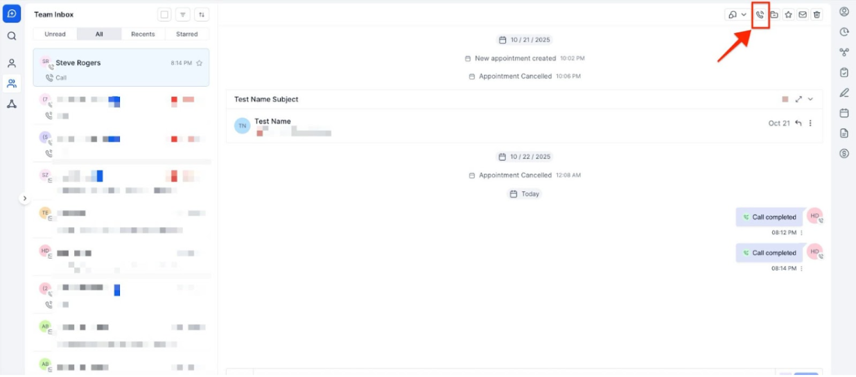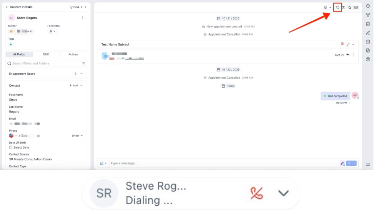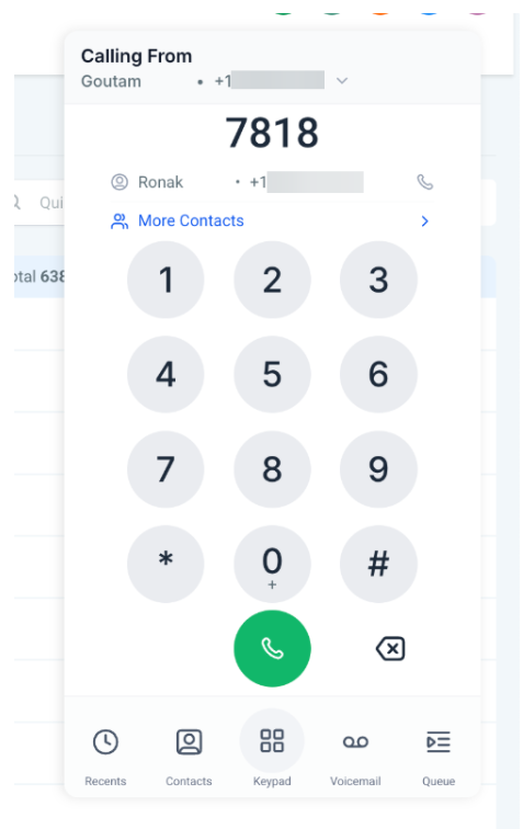 Section titled “Step 1:Making a Call from the Contacts Page”- Click on the green call button in the top right. The icon looks like this: