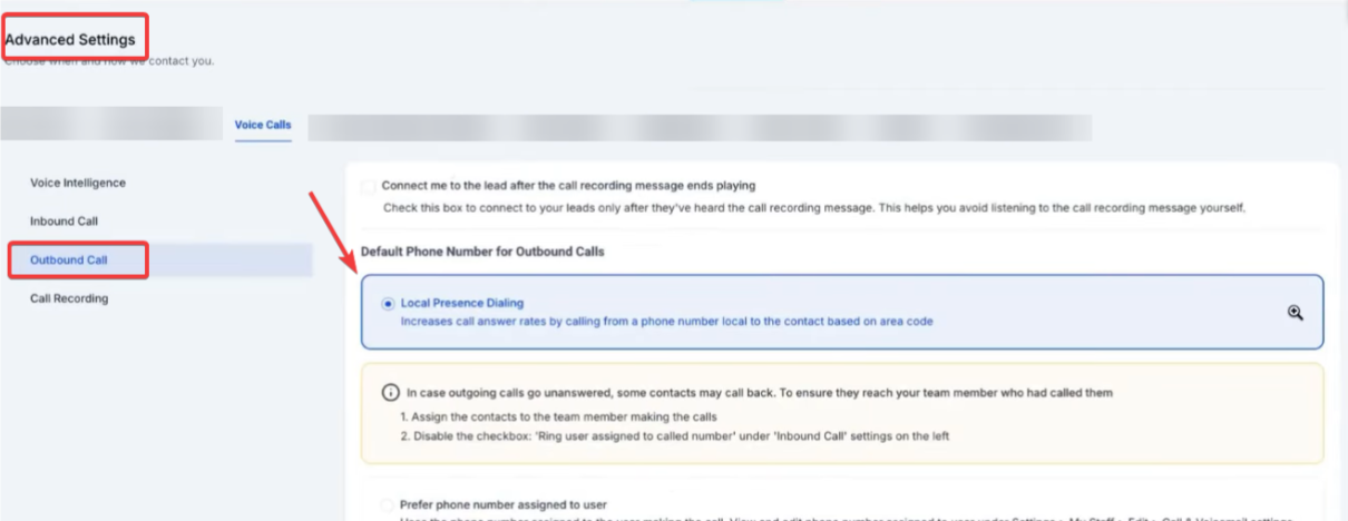 Answer: Local Presence Dialing is a feature that automatically selects the phone number closest to the contact’s area code when making outbound calls to increase the likelihood of the call being answered. You can enable it by navigating to Settings > Phone Numbers > Advanced Settings > Voice Calls.