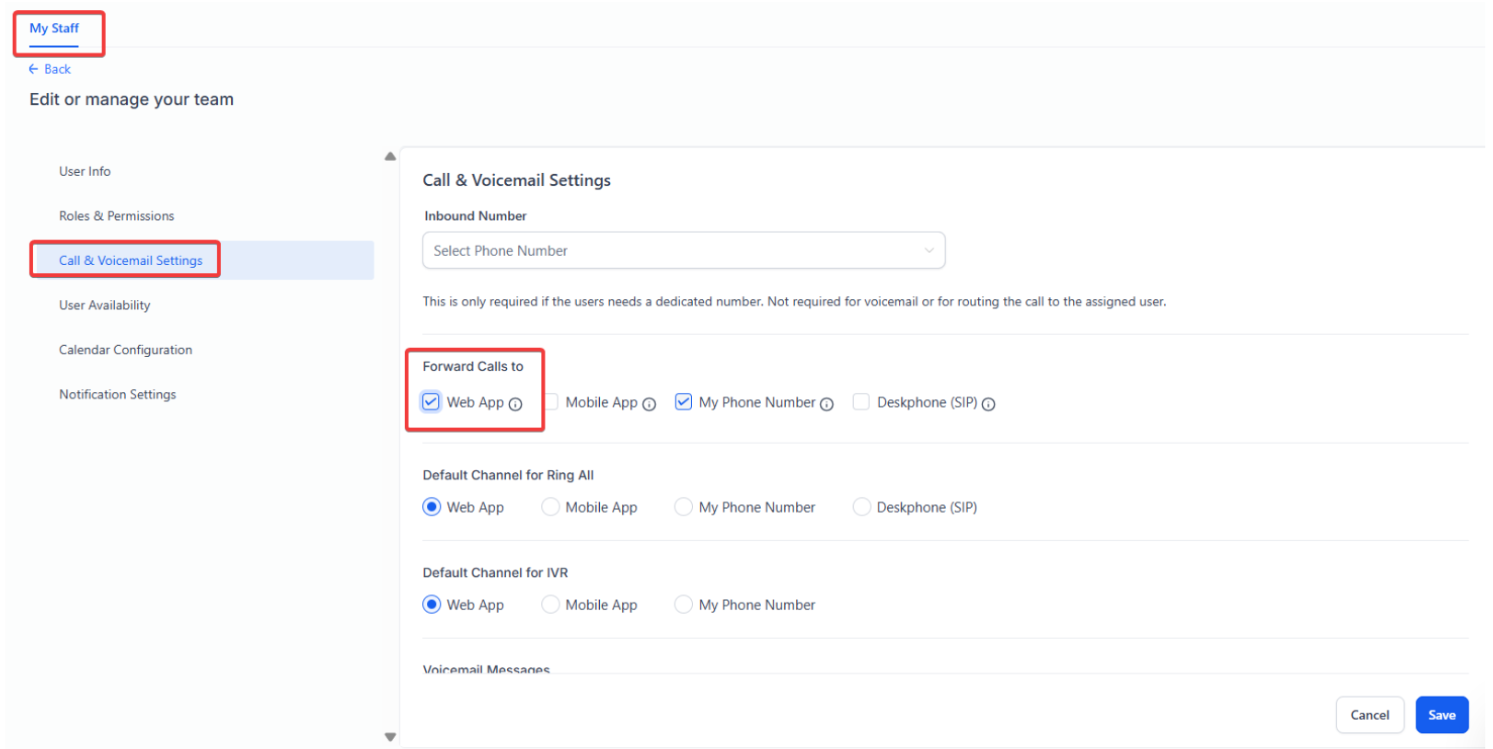Configure Call Settings: Navigate to ‘My Staff’ and edit a user
