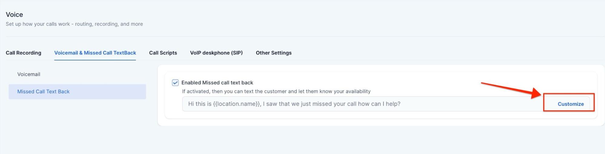 Question: Can I customize the message sent for missed calls? Answer: Yes, you can customize the missed call text message either directly in the settings or through a workflow for more detailed customization.