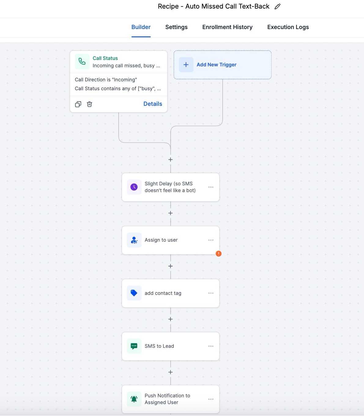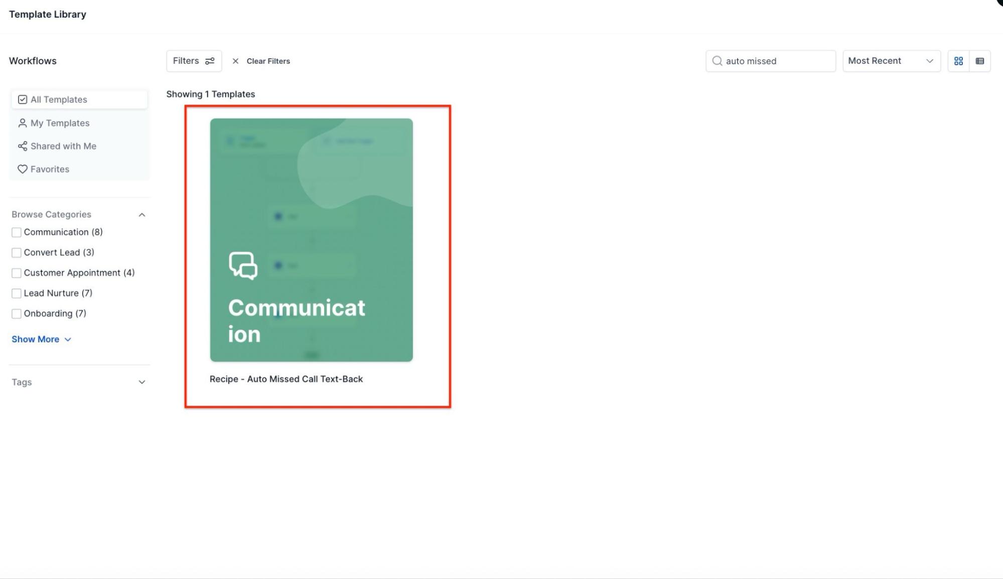 Step 2: Create a new workflow with the “Auto Missed Call Text Back” Recipe