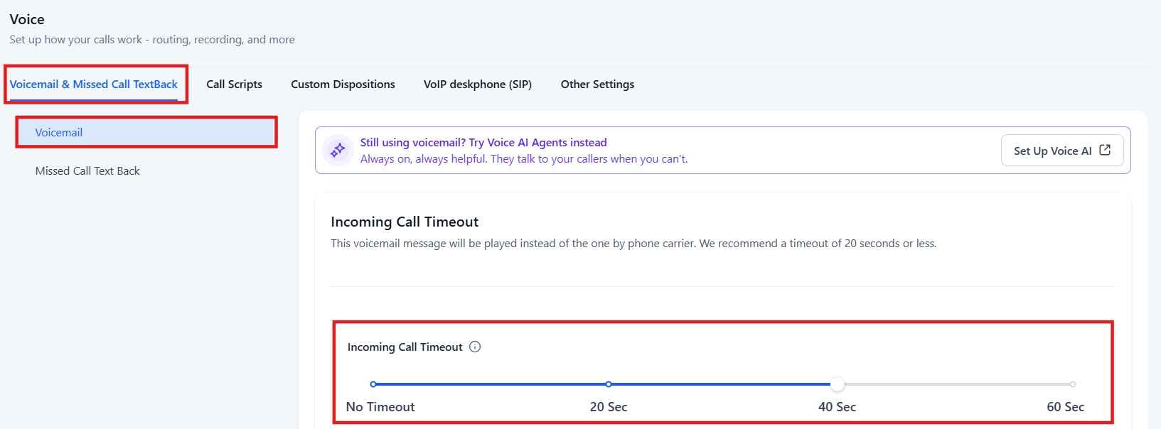 If the timeout is set too high (over 20 seconds), calls might skip your voicemail and be directed to your carrier voicemail instead. This can result in inaccurate call statuses, as calls answered by the carrier voicemail are marked as ‘Completed’ rather than ‘Voicemail’.