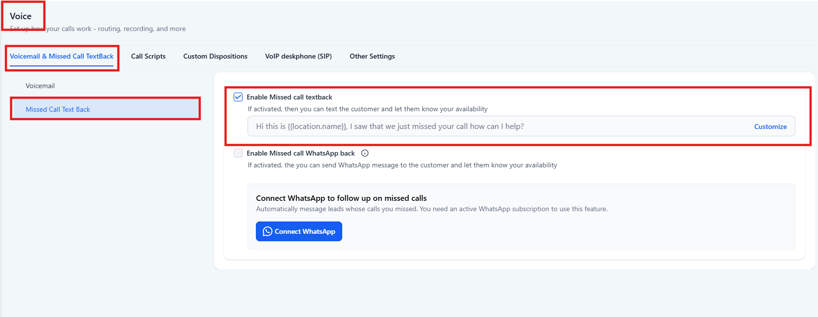 Step 3: Enable and customize the missed call text back