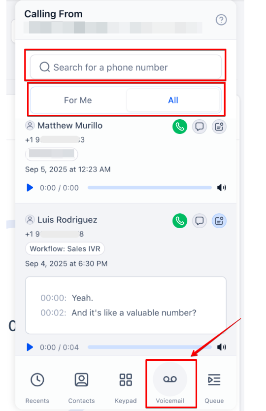 Open the dialer and click the Voicemail tab. View voicemails under the “For Me” tab and click any voicemail to play audio and read the transcription. Use the call or SMS buttons to respond, or search by phone number for specific voicemails.