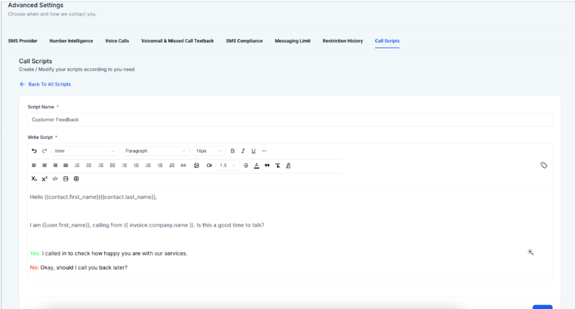 To use this feature, navigate to Settings > Phone Numbers > Advanced Settings > Call Scripts to create or select a script.