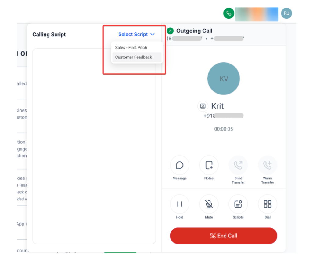 Once created, agents can access the script during calls by clicking on “Scripts” and selecting the appropriate one.