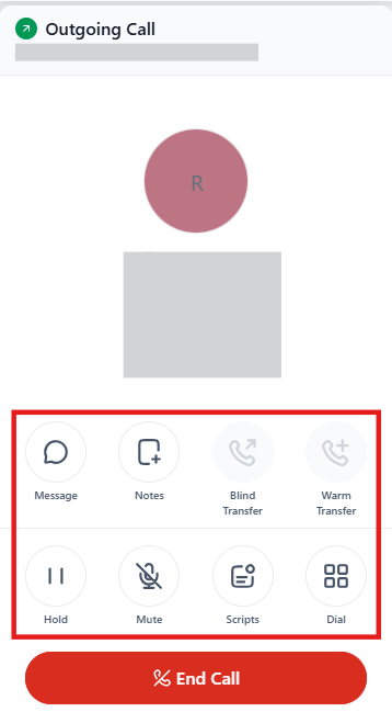 Section titled “Options Within the Dialer”Once you place or receive a call and it connects, you will have the following options: