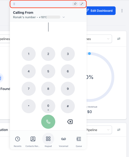 Section titled “Auto-minimize, Pin & Drag ”The dialer automatically minimizes when you click outside of it, allowing you to quickly view contact details or pipeline info without manually closing it.