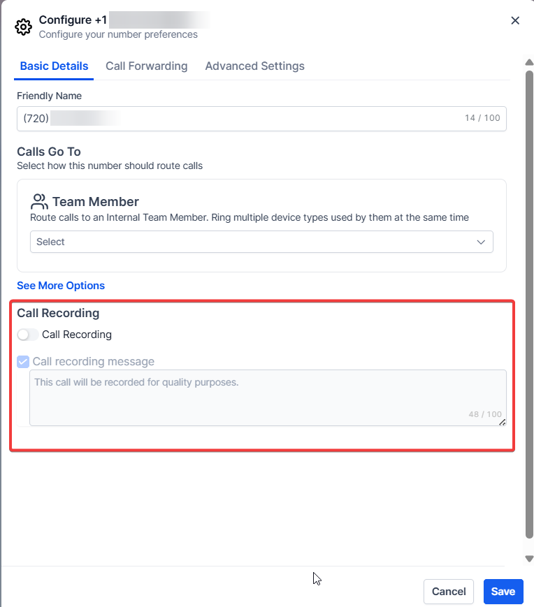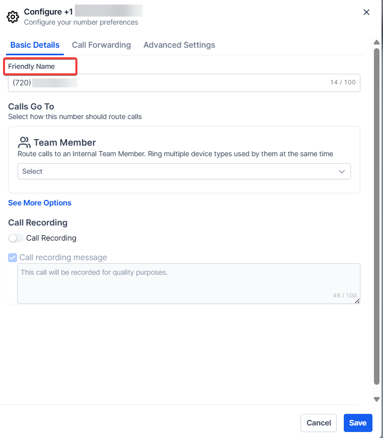 Section titled “Number Name”The Number Name serves as the internal identifier for the phone number. It could be something like a ‘main marketing number’ or the name of the employee assigned to the number.