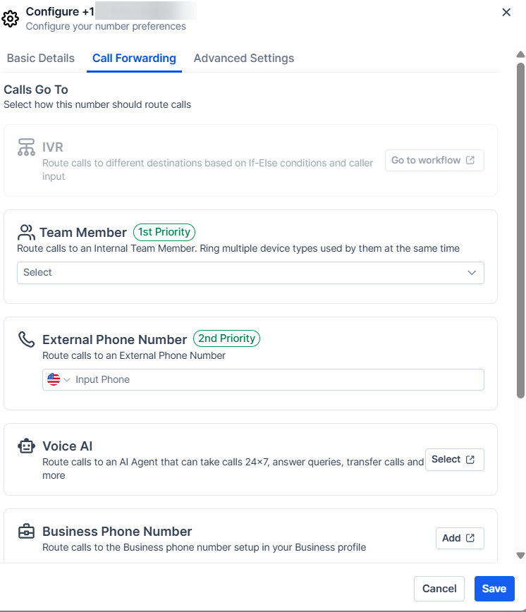Section titled “Forwarding Number”This is the phone number to which inbound calls to this new number should route. When someone calls the new number, the call will be redirected to the number you save here.