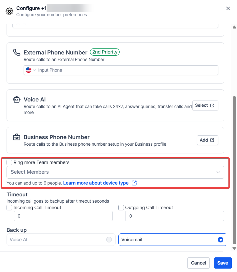 Section titled “Inbound timeout:”This setting determines the time (in seconds) the system allows inbound calls to ring before being dropped or forwarded to a voicemail (personal voicemail or pre-recorded voicemail within the ). Adjust this based on your preferences.