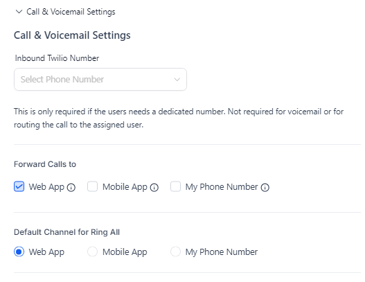 Note: The calls will ring on the specified channel of the user. If both the Mobile App and the Web App are available, the call will ring on the Web App.