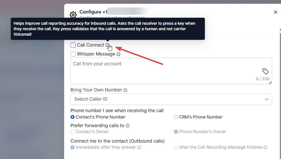 We can eliminate the possibility of confusion by checking the checkbox. By checking the box, the receiver of the inbound call must press a key to connect. That way, the system always knows whether or not a call was answered by a human, which is why we recommend turning this on.