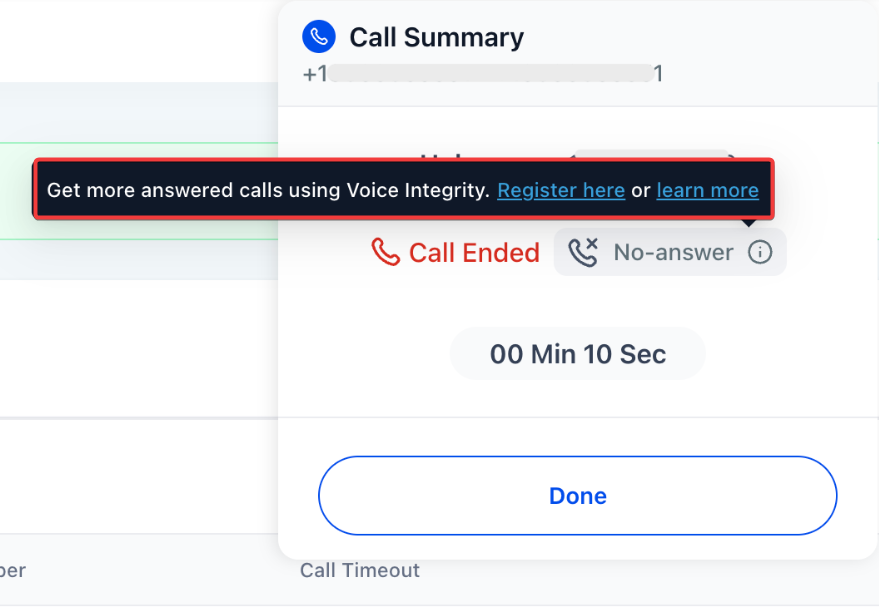 To support better outbound call performance, displays a helpful tooltip in the web dialer after an unanswered call, recommending registration with Voice Integrity.