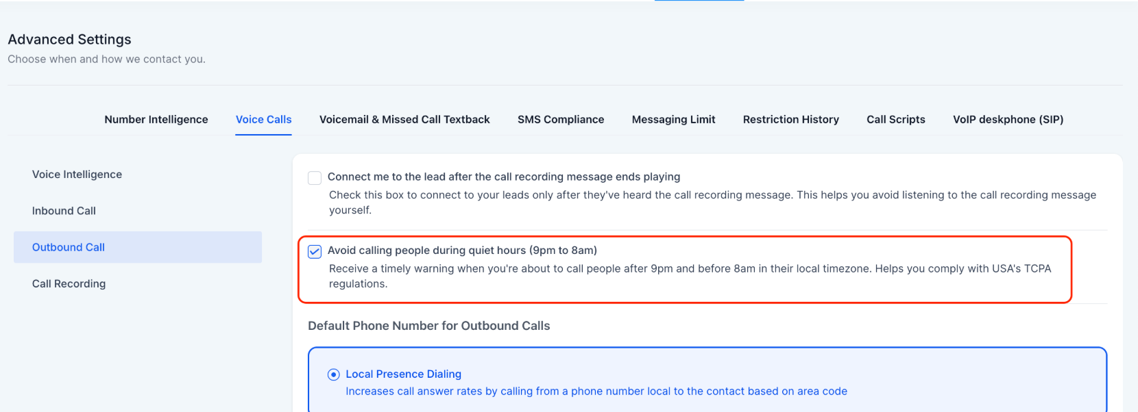 Section titled “Advanced Settings:”Quiet Hours for Outbound Call