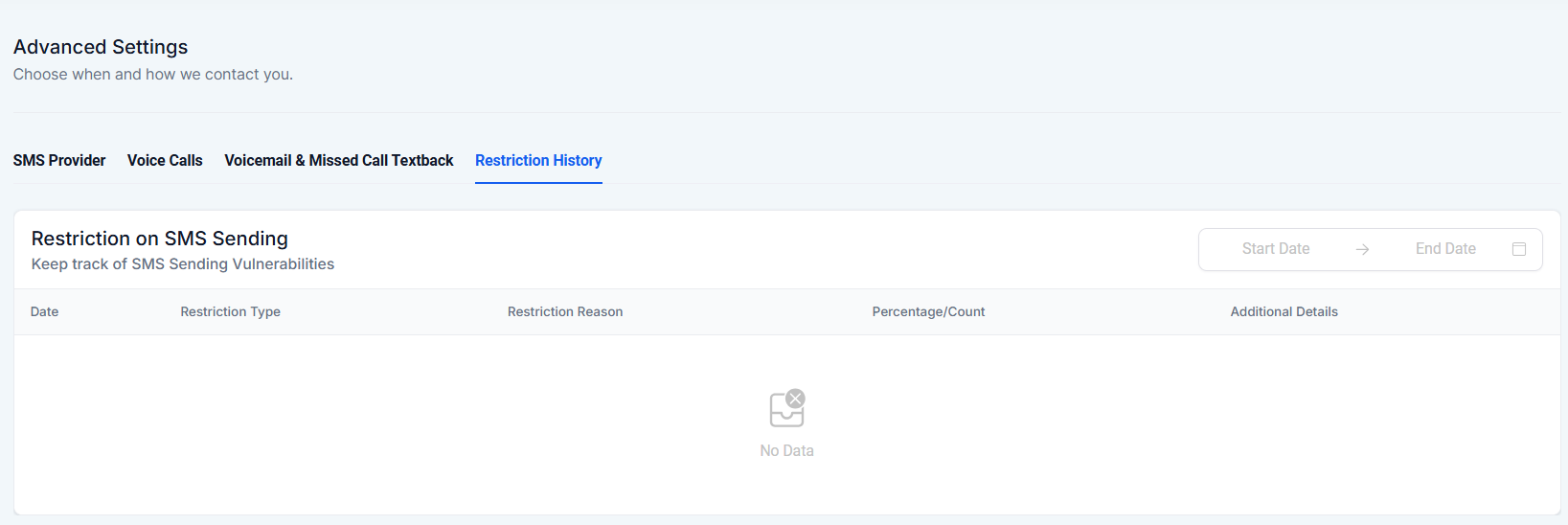 Question: How can I view my SMS Restriction History? Answer: You can view your SMS Restriction History by navigating to the Settings tab and selecting Phone Numbers from the settings menu. Then, go to Advanced Settings and click on Restriction History. This feature allows you to track any adverse actions related to your SMS sending activities, such as daily or weekly limit violations, warning emails, and temporary restrictions based on specific criteria like opt-out rates.**