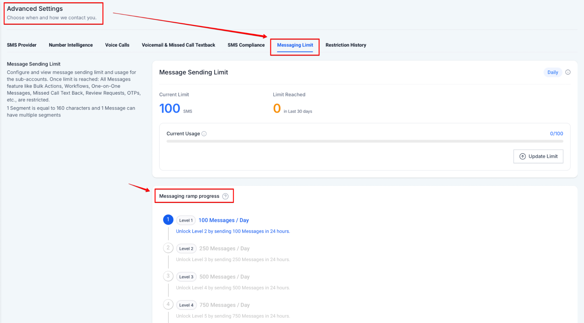 Users can access this feature under Settings > Phone Numbers > Advanced Settings > Messaging Limit, ensuring compliance with all messaging requirements.