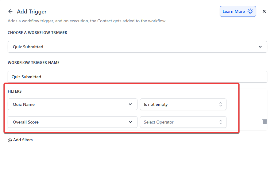 Section titled “Pro Tips”- Use Conditional Filters Wisely: Combining multiple filters ensures that only relevant quiz submissions trigger workflow actions.
