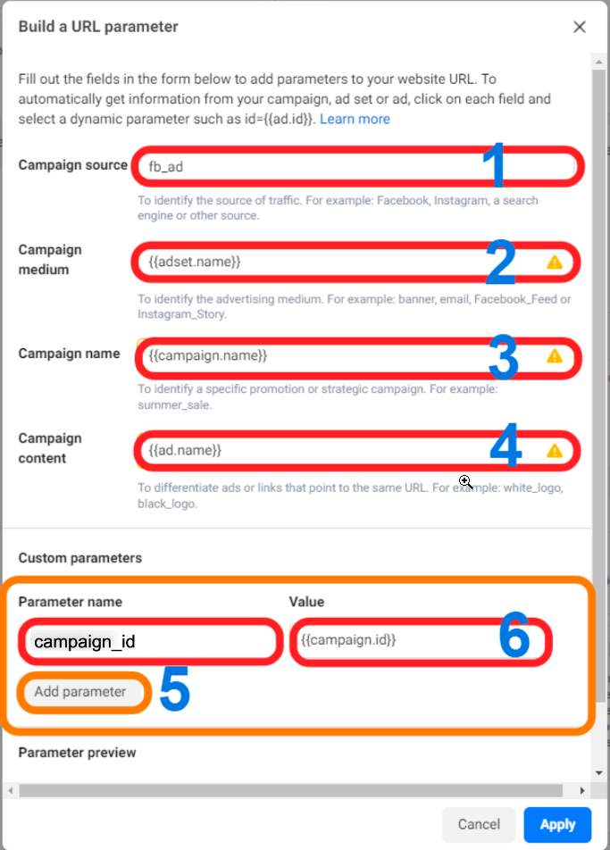 Section titled “3- Complete the steps below for URL parameters”- Click on “Campaign Source” and type “fb_ad” into the field