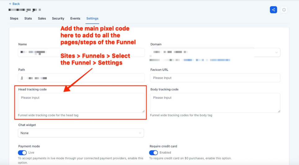 Answer: To track using a Meta Pixel, navigate to Sites > Funnels/Websites and select your specific site. Go to the Events tab to add your Pixel ID, and ensure the main tracking code is pasted into the Settings tab of the site.