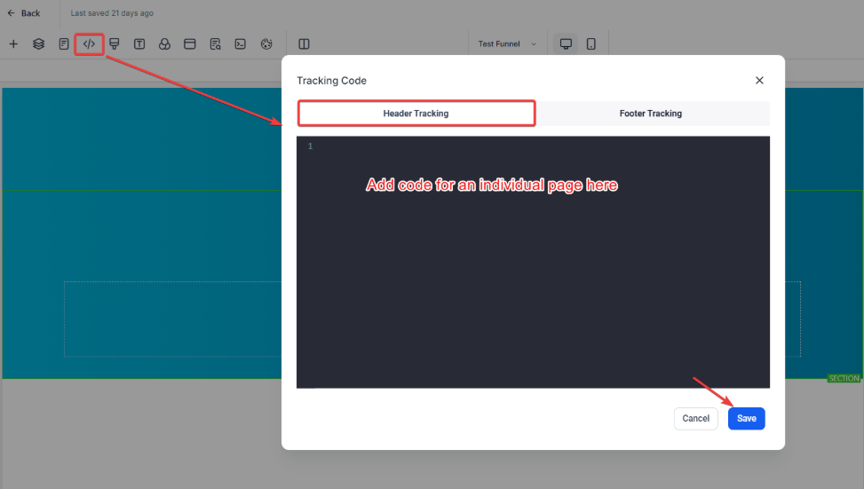 Section titled “5- Add to the websites within”Add the main tracking code to all pages from Sites > Funnels/Websites > Selected Site > Settings tab.