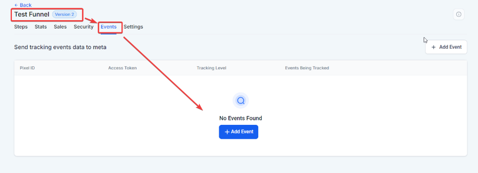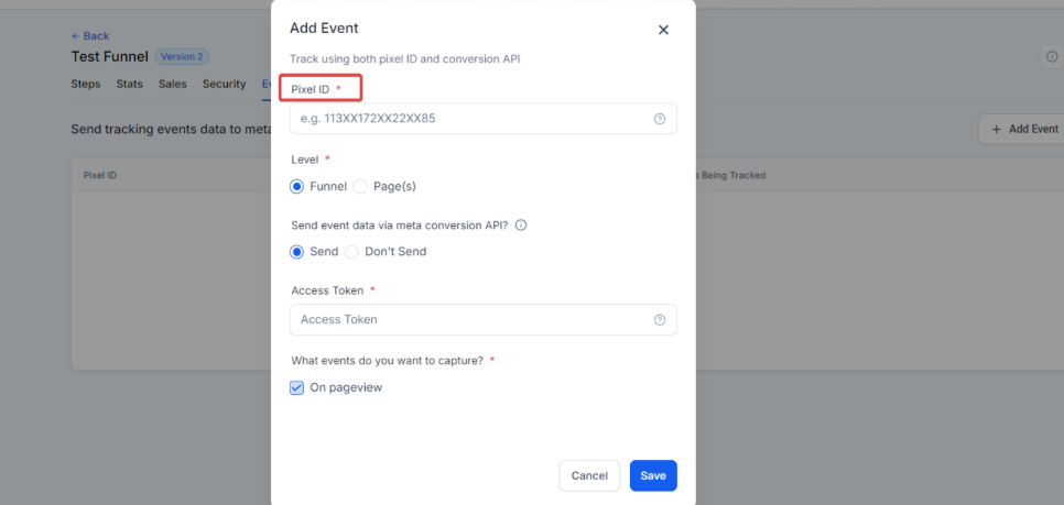 Section titled “Track with Pixel ID:”To track with the help of Meta Pixel, you’ll need to add the pixel ID. Navigate to Sites > Funnels/Websites > Events: