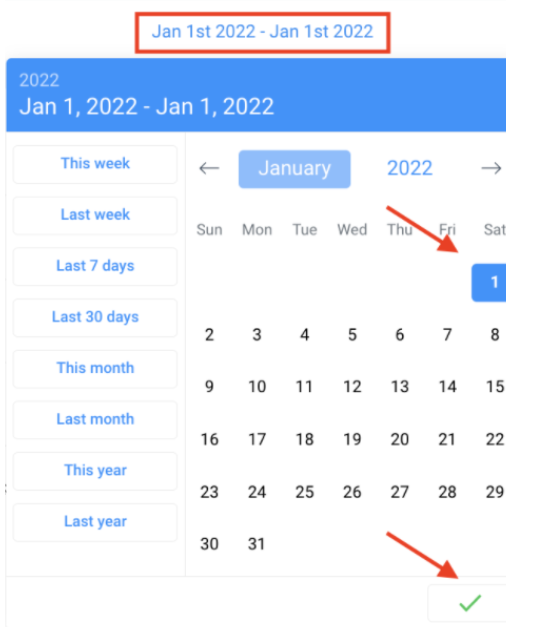 NOTE: If you wish to view reporting metrics for one day, check that date as the start and end date. You must have both selected for the stats to appear. The example below shows how you can run reports for January 1, 2022, by choosing January 1st as the start and end date: