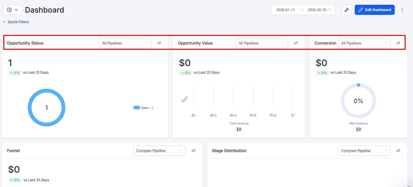 Section titled “Row 1:”- Opportunity Status: Status of Leads in your Pipeline