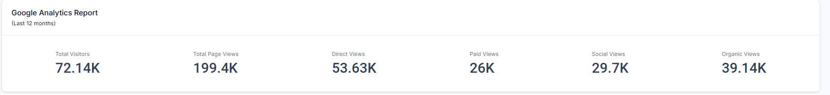 Section titled “ Row 5:”- Google Analytics Report: This section provides insights into your website’s traffic and user behavior. It explains key metrics such as traffic sources, user engagement, and how visitors interact with your site. By understanding these metrics, you can optimize your online presence and enhance user experience