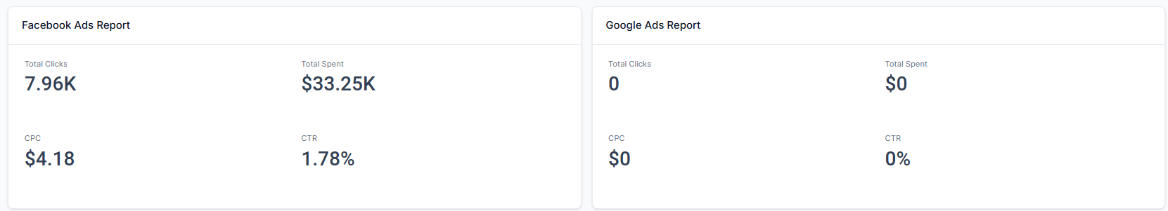 Section titled “ Row 7:”- Facebook Ads Report: This report shows the performance of your Facebook ad campaigns. It explains metrics such as total clicks (how many times your ads were clicked), total spend (how much was spent on ads), cost per click (CPC), and click-through rate (CTR). These metrics help evaluate the effectiveness and return on investment (ROI) of your Facebook ads.