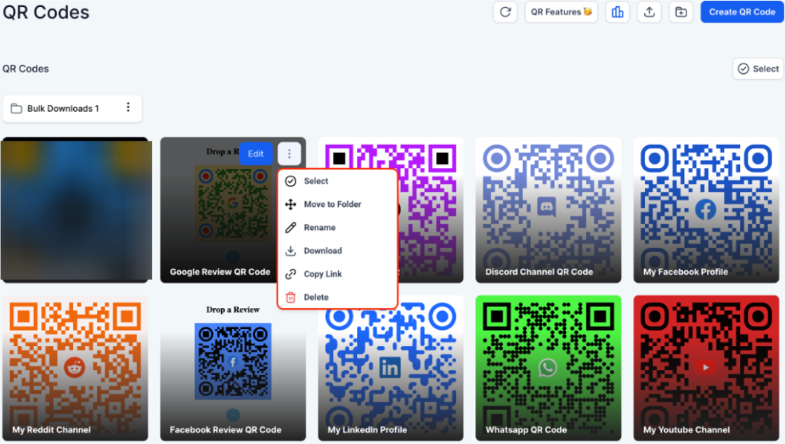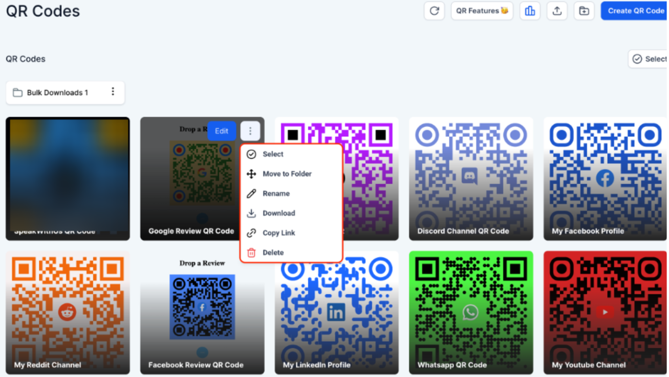 The QR Code list supports bulk actions, inline renaming, and a quick link copy option to simplify daily tasks and reduce time spent on repetitive steps. These tools allow users to manage multiple QR Codes at once, rename items directly on the list, and copy links instantly without switching pages.
