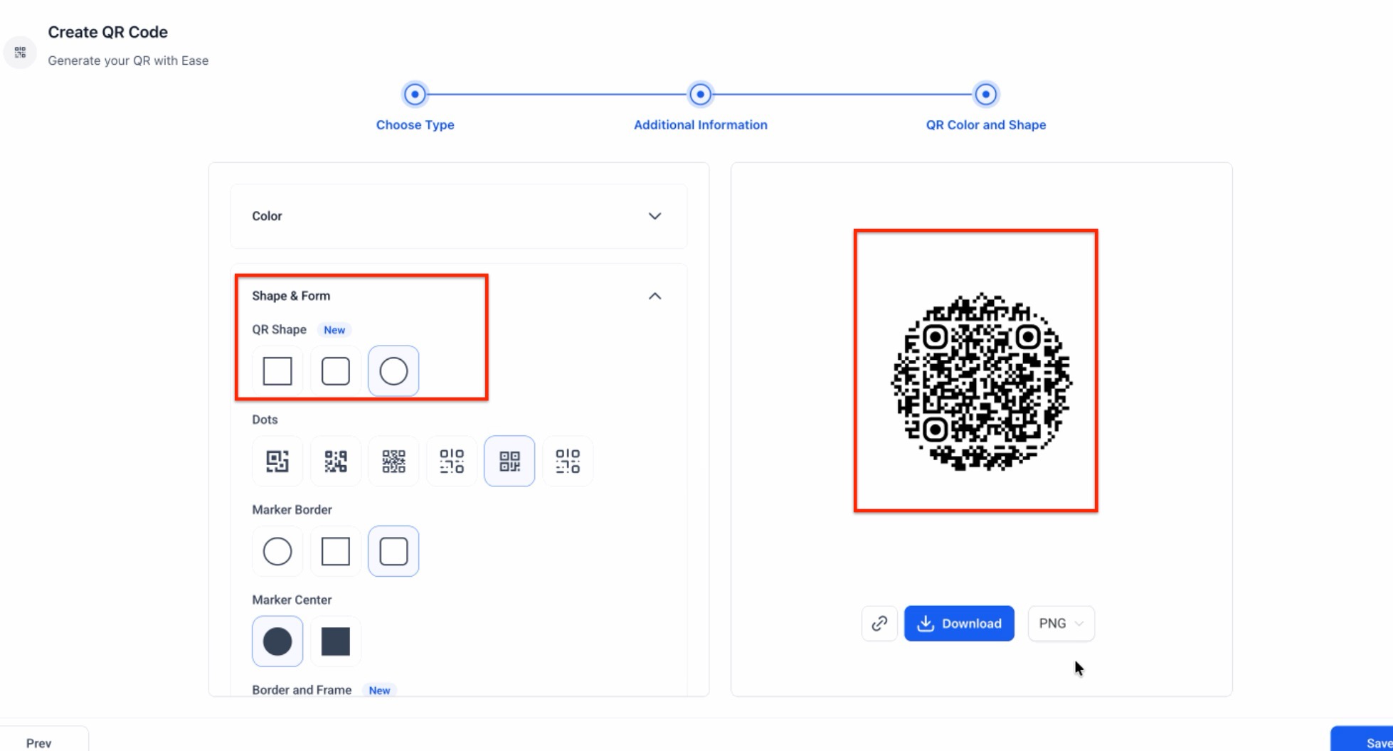 - Shape & Form: You can select from standard, Rounded, or Circular QR code shapes for a more contemporary aesthetic.