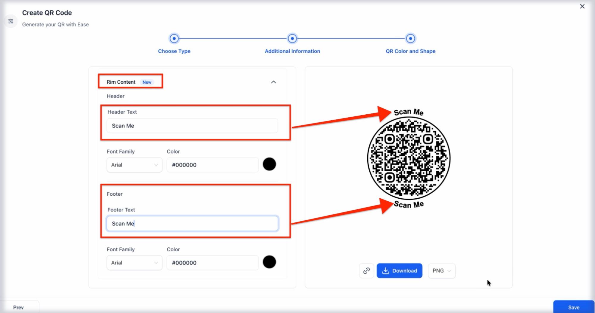 - Rim Content: Add “Call to Action” (CTA) text to the top and bottom (the rim) of the QR code to provide clear instructions to your users.
